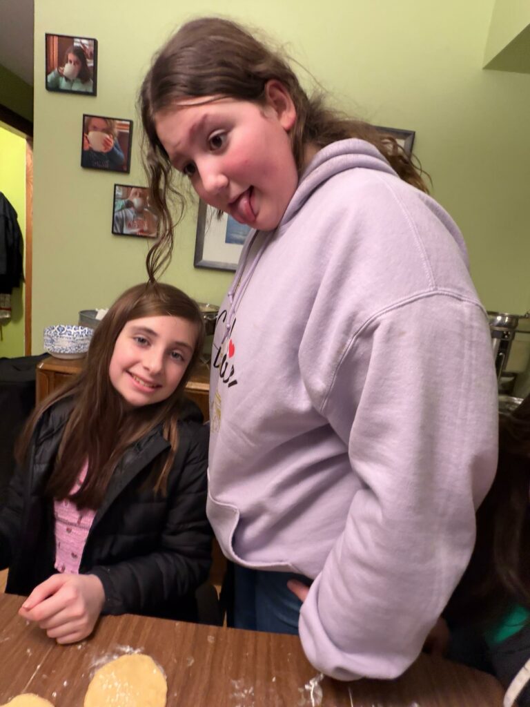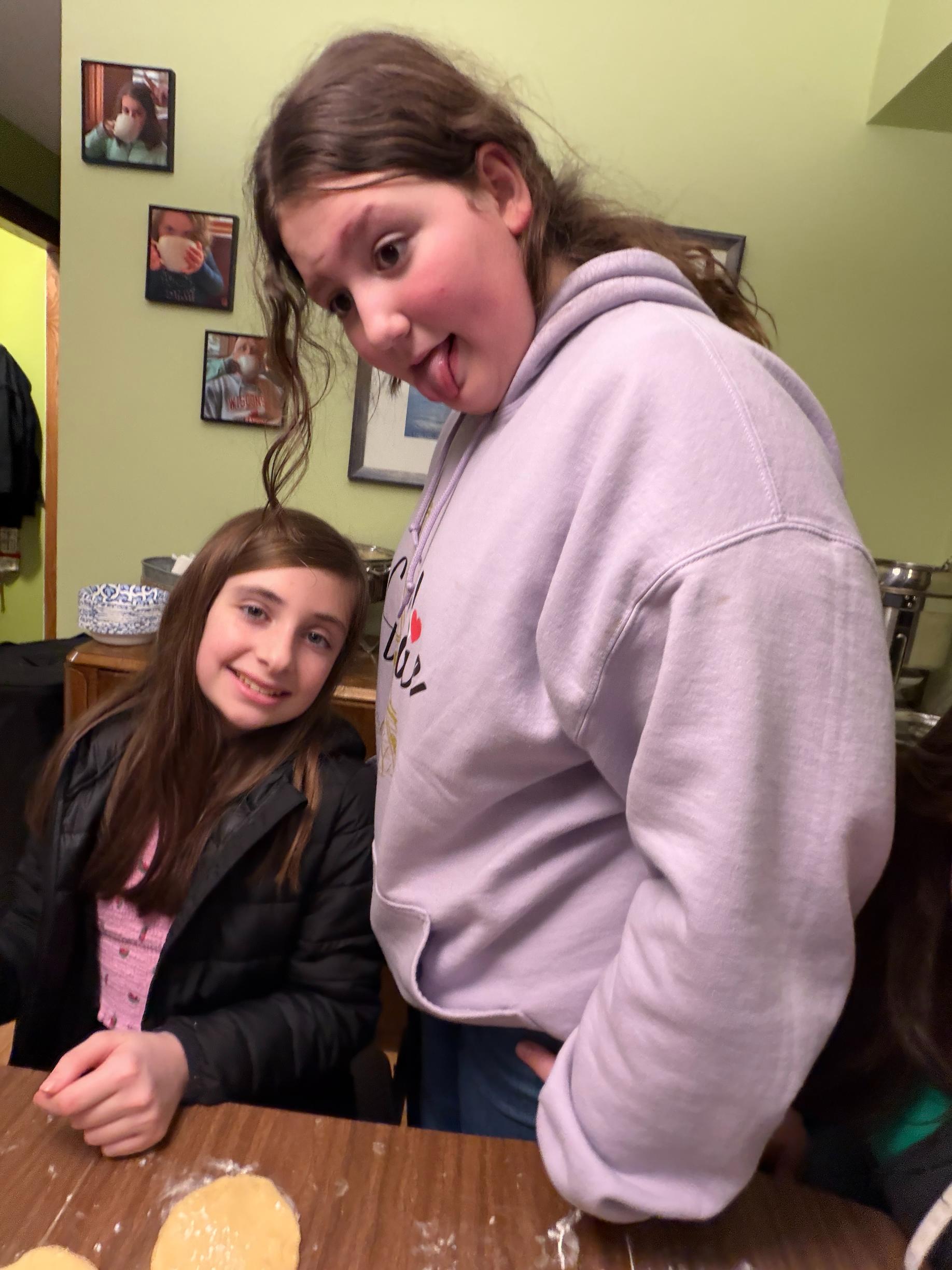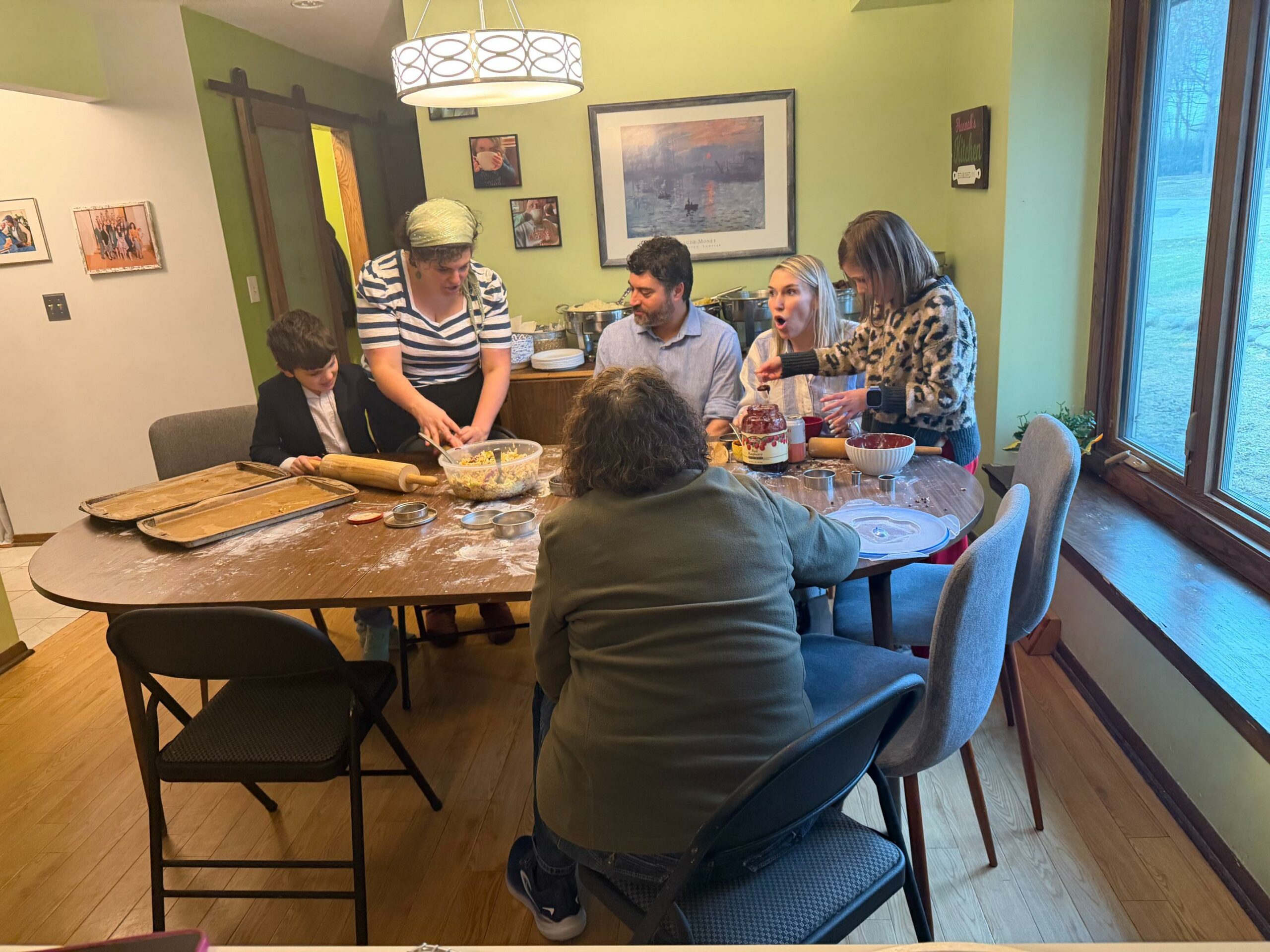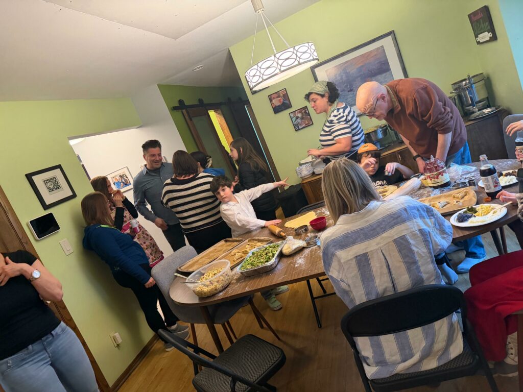 We make mountains of dough and filling. Everyone rolls and cuts. My oven is overwhelmed. I serve lunch or dinner depending on the timing. People stay and talk. Some years the kids take over. Some years the adults are the most enthusiastic. This year, the adults were fully in it, and the kids drifted in and out.